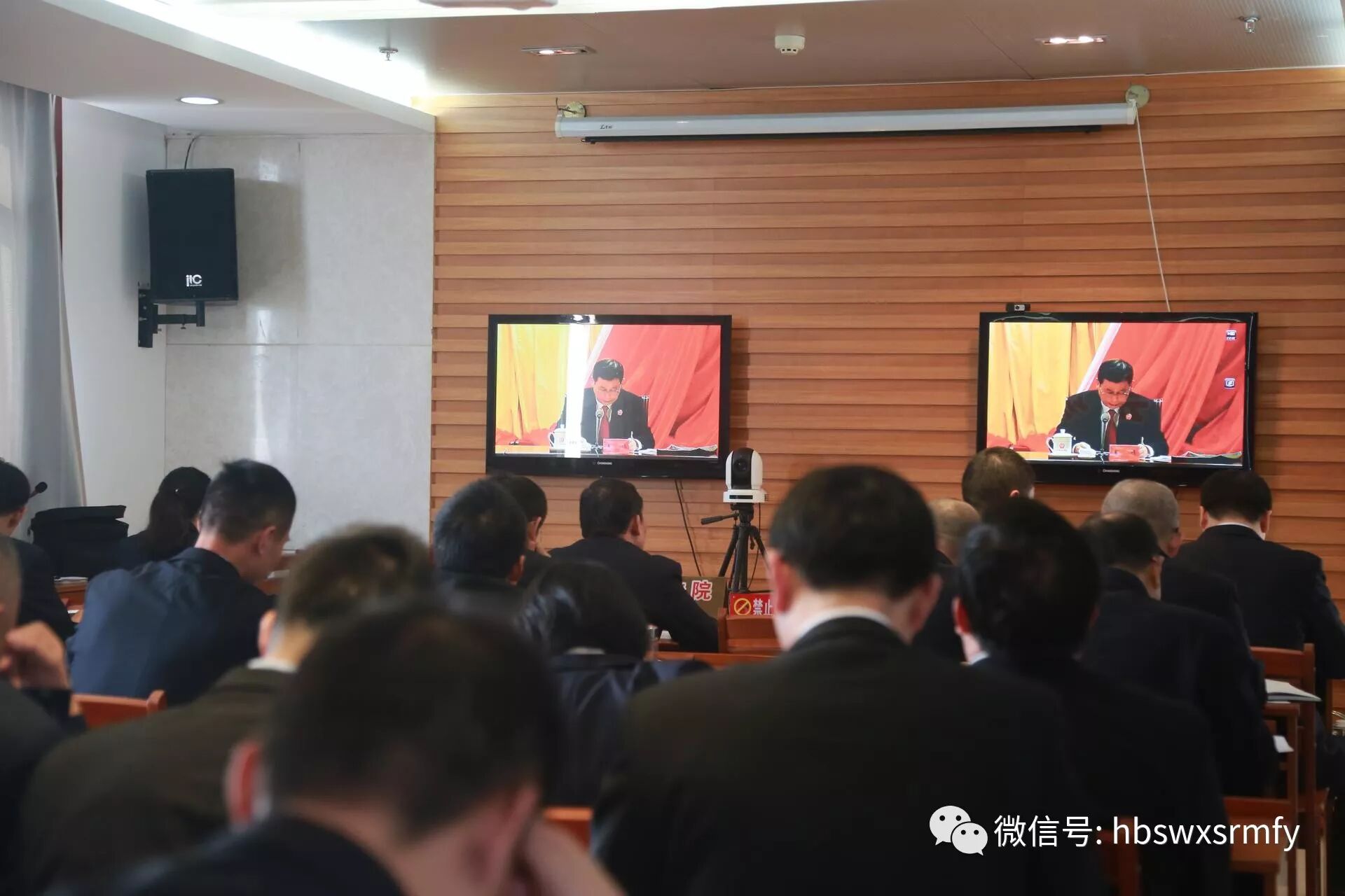 2017年11月3日下午,我院院领导及各部门负责人共30余人,通过远程视频系统,集中收看了最高人民法院副院长姜伟在全国法院贯彻党的十九大精神辅导报告会上的辅导讲话。(院长黄亚东同志带头认真学习)(参会人员认真学习会议精神)